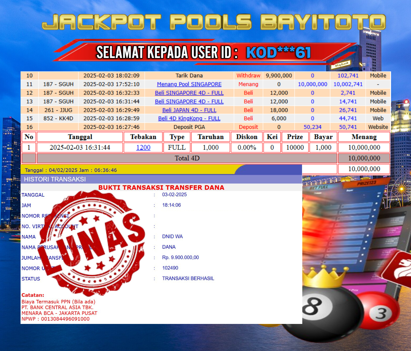 Selamat kepada User id : KOD***61 Telah berhasil mendapatkan kemenangan besar pa